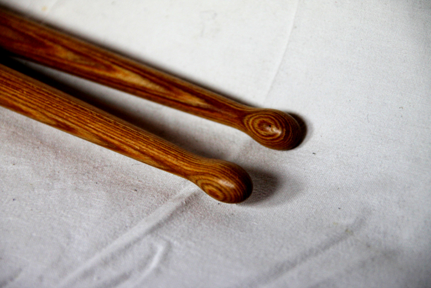 Aus Hartholz gedrehte dünne Trommelschlägel.