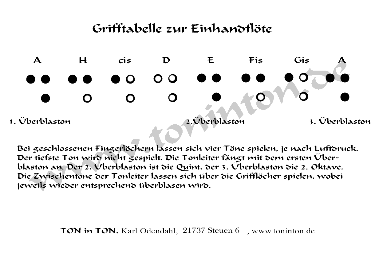 Die Obertonreihe baut sich so auf, das zwischen dem zweiten und dem dritten Überblaston eine Quint also ein Fünfton-Intervall, liegt. Es werden dabei drei Töne der Tonleiter übersprungen. Um dies auszugleichen hat die Einhandflöte 3 Fingerlöcher. Zwei für Zeige- und Mittelfinger auf der Oberseite und ein Loch für den Daumen auf der Unterseite. Zwischen Ringfinger und kleinem Finger kann die Flöte am Fuss gehalten werden. Durch weiteres Überblasen kann insgesamt eine Oktave, manchmal auch noch die None, ein Ton mehr, gespielt werden.